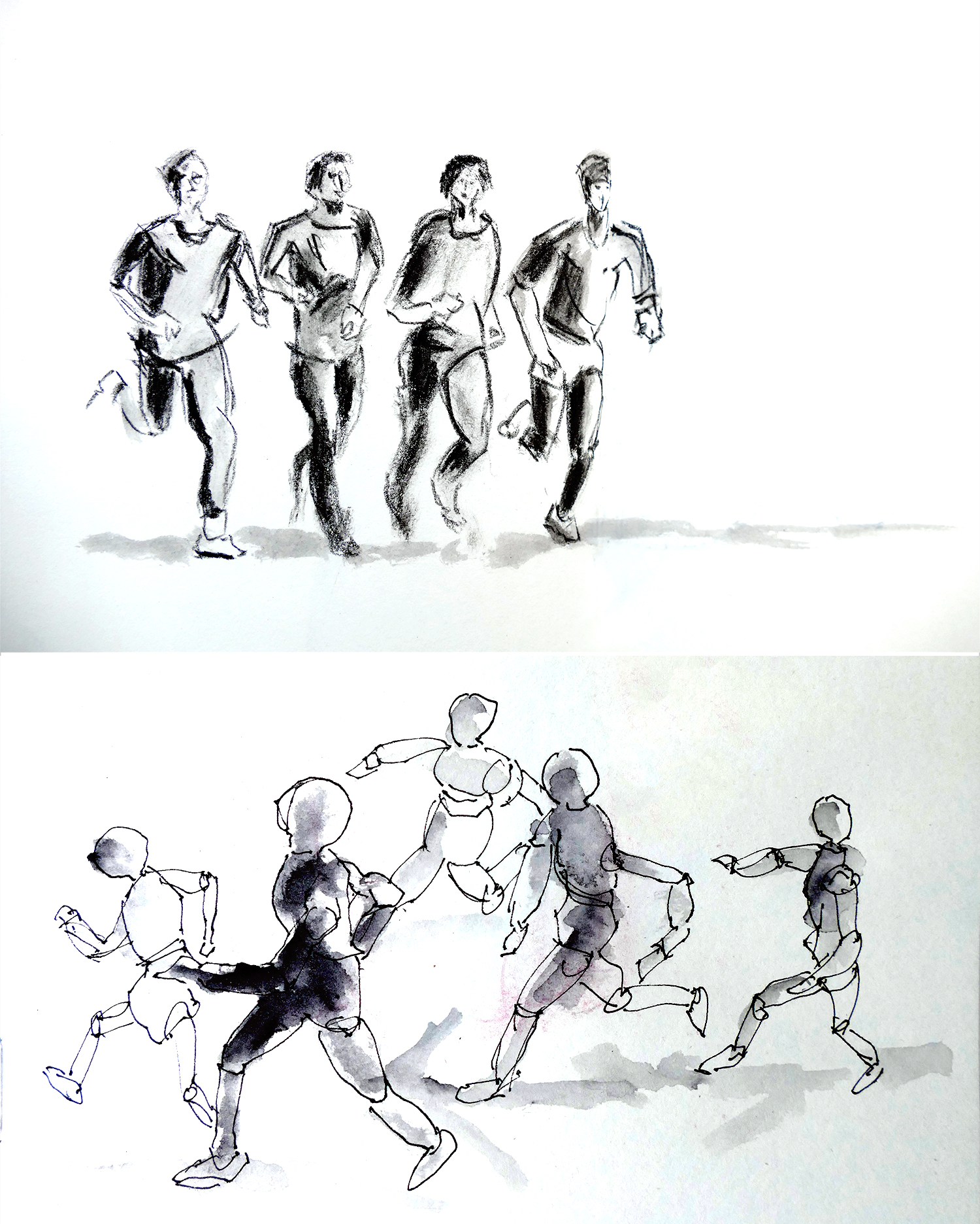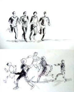 Schräg von unten, schräg von oben, laufend, rennend, schreitend, Bewegung fällt einfach ins Auge. Tipp: Eine hölzerne Gliederpuppe (auch „Künstlerpuppe“) aus dem Künstlerfachhandel hilft ungemein, das Auge zu schulen. Um die Perspektive zu wechseln, die Puppe einfach auf den Fußboden stellen oder erhöht auf einen Schuhkarton.
