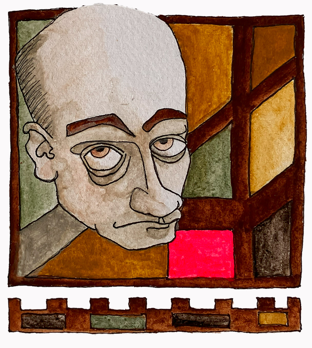 Auf indisches Khadi-Papers mit einem weichen Bleistift vorgezeichnet (weich, damit man ihn später spurenlos wegradieren kann), die Konturen mit einem Fineliner mit wasserfester Tinte nachgezeichnet und mit Kuretake-Gansai-Tambi- und Kremer-Aquarell koloriert. Dabei habe ich darauf geachtet, alle Felder – bis auf eines – Ton-in-Ton einzufärben.
