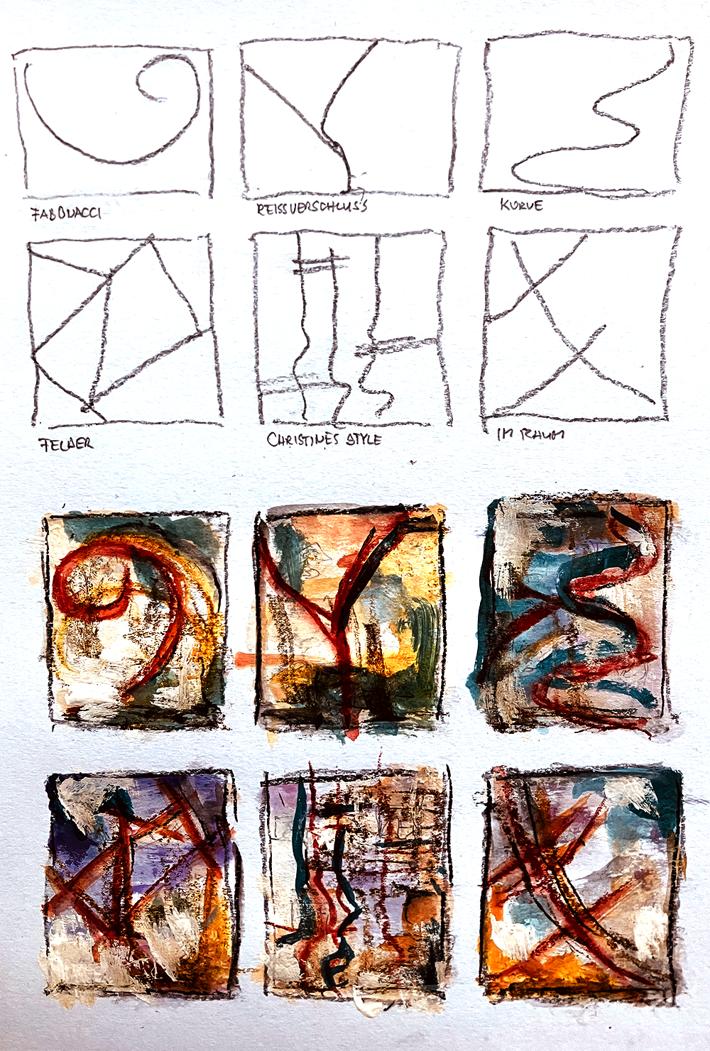 Wahrscheinlich aber wird abstrakte Kunst ohne Wissen um Farben, Techniken und ohne Gespür für eine gewisse Spannung bei der Bildaufteilung langweilig und nichtssagend. Hier abgebildet sind sechs von mir angelegte Bildkonzepte, aus denen ich eines auswählte, um anschließend das eigentliche Bild zu malen.