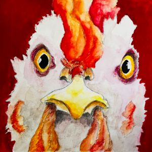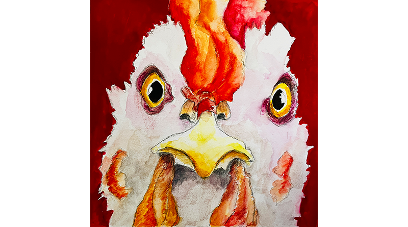 Im Boesner Veranstaltungskalender „Januar – April 2026“ fand ich folgendes Huhn. Es ist ein Werk von Anita Hörskens, in Aquarell ausgeführt. Ich habe das Original kopiert.