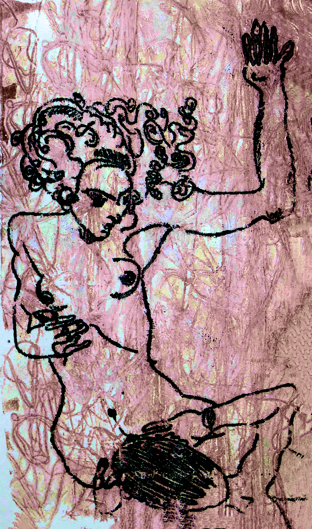 Den Hintergrund habe ich angelegt, indem ich Linolfarben (weiß und rot gemischt) mit einer mit Bindfarben umwickelten Walze aufgetragen habe. Das Schiele-Motiv ist im Anschluss durch Monotypie-Druck (schwarze Pastellfarbe) übertragen worden.